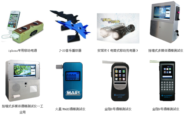 公司目前研发生产的iphone专用移动电源,外观由香港注名的癲噹动漫合作社设计打造,为全球唯一通过“香港安全认证中心”认证的移动电源产品,已出口到世界各国,深受广大消费者的喜爱和好评。目前自主研发生产有警用级金刚系列酒精测试仪和民用级系列酒精测试仪。