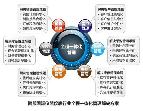 对仪器仪表企业而言,一款好的信息化解决方案,不仅能够满足企业解决当前管理痛点的迫切需求,更要为企业长远发展打下坚实基础。智邦国际成立至今十多年来,服务了北京东南仪诚、天美(中国)、上海创远、江阴众和电力仪表、郑州明锐电子科技等众多仪器仪表大型客户。基于十多年解决该行业各种管理问题的成功经验,以及对众多仪器仪表企业的深入调研分析,并结合“7C管理”先进管理思想,研发了一整套专门针对仪器仪表行业的全程一体化管理解决方案。