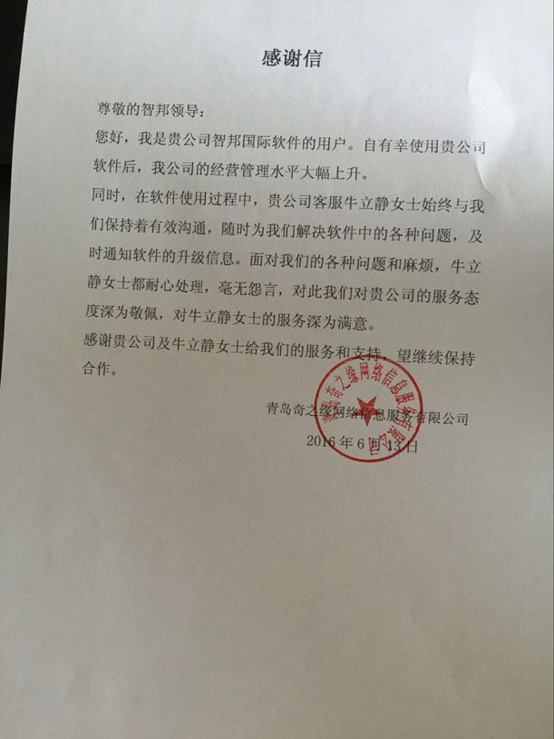 山东青岛奇之缘网络信息服务有限公司感谢信