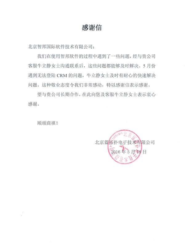北京蓝拓扑电子技术有限公司感谢信
