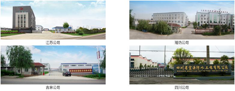 宏源防水下辖潍坊市宏源防水材料有限公司、四川省宏源防水工程有限公司、江苏宏源中孚防水材料有限公司、吉林省宏源防水材料有限公司、广东宏源化工建材有限公司(筹建中)五大生产基地;北京、上海、广州、天津、重庆、成都等七个分公司;全国地市级以上城市均设有办事处,拥有三百多家优秀代理商、一千多家特约经销商和产品售后服务机构。