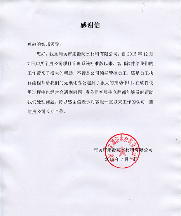 山东潍坊宏源防水材料有限公司与智邦国际正式签约,希望在智邦国际项目管理系统的协助下,实现项目从立项到收尾全过程的实时监控和统计分析,降低项目管理成本,提高项目实施效率,更好、更快的完成客户项目交付!