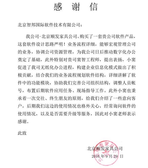 当今社会,市场竞争日趋激烈,谁能比竞争对手更快一步,谁就能更快抢占先机获得成功,先进信息系统的应用、业务流程的重塑是企业快速发展的必经之路。相信在智邦国际CRM系统的协助下,北京顺发家具公司定能实现客户信息高度集成与共享,从海量客户资源中快速筛选、挖掘价值客户,通过简捷、高效、无缝的客户流程,全面提升客户满意度与忠诚度,通过科学选择和管理实现客户价值最大化。