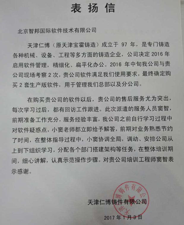 天津仁博铸件有限公司感谢信