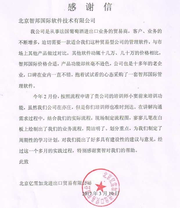 随着公司快速发展以及团队不断壮大,现有管理模式弊端逐渐显露。管理层意识到,要想在激烈的市场竞争中保持快速发展,立于不败之地,必须采用专业、成熟、高效的信息化管理系统。经过深入的市场调研和业内专业人士推荐,最终,北京亿雪加龙进出口贸易有限公司决定与智邦国际合作。了解其业务特点和管理需求后,智邦国际工程师第一时间为其部署了一套ERP系统。