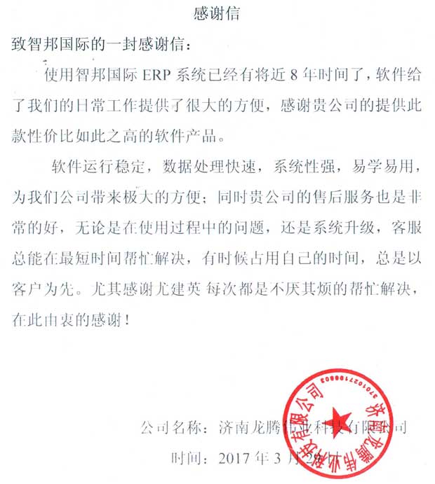 山东济南龙腾伟业科技有限公司感谢信
