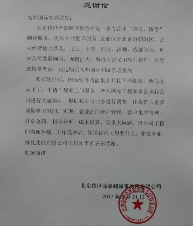 只要有商业行为存在就有CRM,CRM可以帮助企业管好客户资料,帮助企业追逐最大利润。相信在智邦国际CRM系统的协助下,北京传世译嘉翻译事务所有限公司定能打造信息化管理模式,实现客户管理集成化、规范化、智能化,实时响应和快速满足客户需求,为客户提供优异的产品、服务和支持,不断拓展业务新天地!