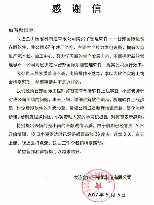 在激烈竞争的市场环境中,只有不断完善管理理念,才能与时俱进。相信在智邦国际进销存系统的协助下,辽宁大连金山压缩机制造有限公司定能全面提升了决策执行效率和业务运转效率,使企业管理化繁为简、化难为易,为从内到外全面提升信息化管理水平,实现可持续发展打下坚实基础。