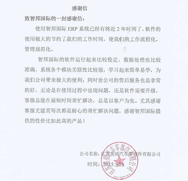 先进的进销存系统,可以帮助企业实现进货、销售、库存、付款等各项业务的集成,快速提升工作效率和管理水平。相信在智邦国际进销存系统的协助下,江苏美顿汽车零部件有限公司定能实现对客户、销售、采购、库存、产品、财务等环节的全方位跟踪与管控,用精细化、信息化、协同化管理模式,取代传统落后的手工作业,以更优产品、更快响应、更低成本,为客户带来全新合作体验。