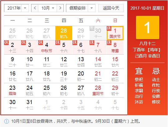 10月1日(星期日)至8日(星期日)放假调休,国庆节与中秋节连休,共8天。9月30日(星期六)、10月9日(星期一)照常上班。放假期间若给您带来不便,敬请谅解!