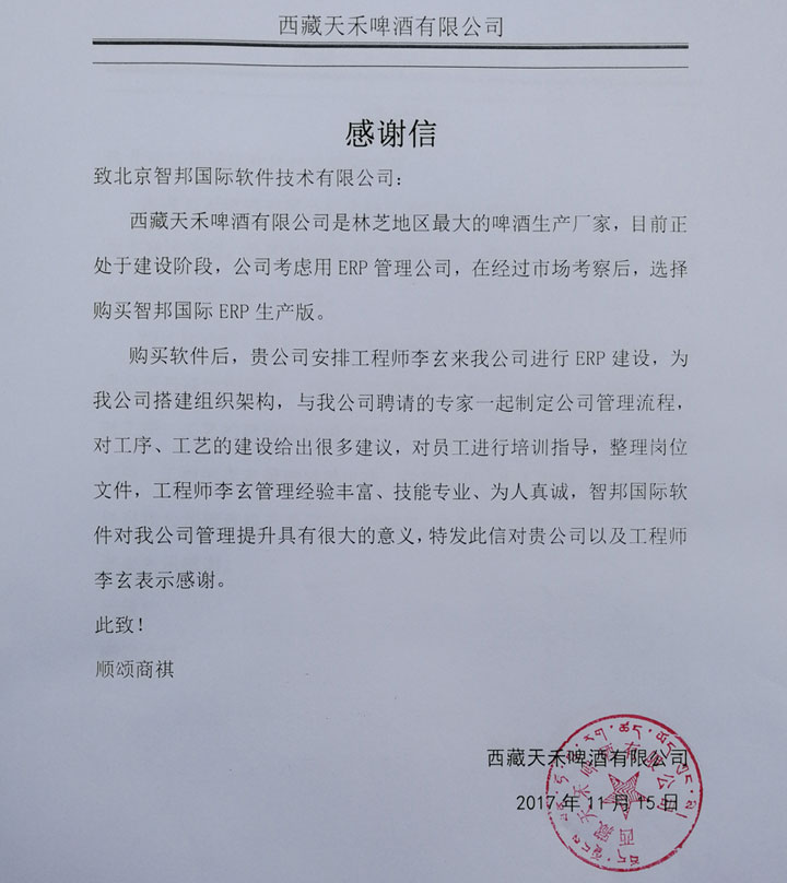 西藏天禾啤酒有限公司感谢信
