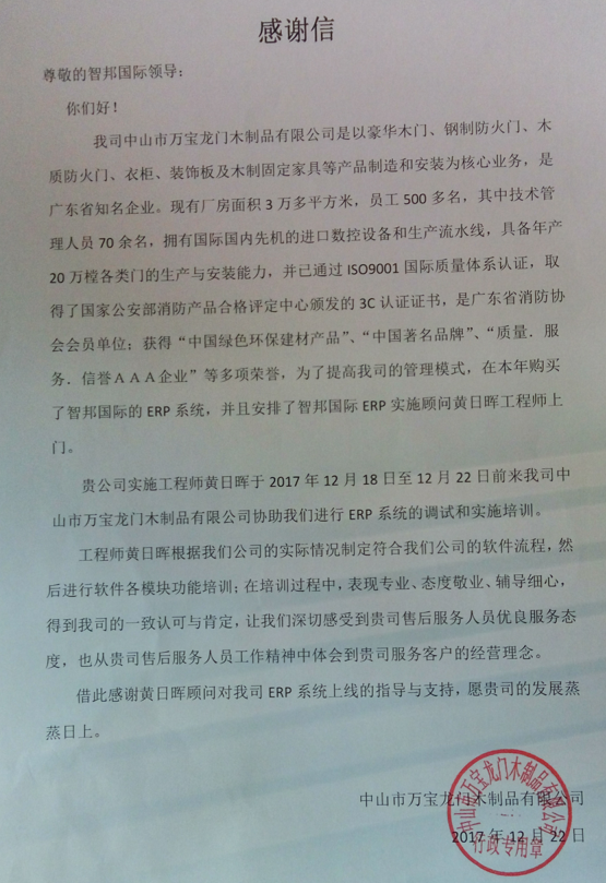 随着中山市万宝龙门木制品有限公司十多年的发展,企业从生产、销售、库存等部门逐步扩张,原有的传统方式已经不能满足企业发展需求,因此管理上急迫的需要现代化管理软件来协助。中山市万宝龙门木制品有限公司通过功能、服务、软件商资质等多方面考察和甄选,最终与智邦国际达成合作;在了解客户情况后,智邦国际实施工程师立即根据其情况制定了实施方案,为其部署了智邦国际ERP系统。