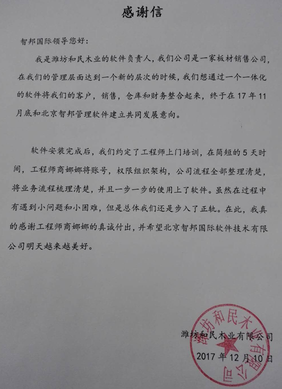 优秀管理软件的应用,可以让企业管理事半功倍。相信在智邦国际ERP系统的协助下,潍坊和民木业有限公司定能通过科学高效的信息化管理,协助企业发展如鱼得水。