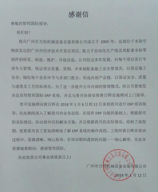 广州市万恒机械设备安装有限公司智邦国际ERP系统实施现场