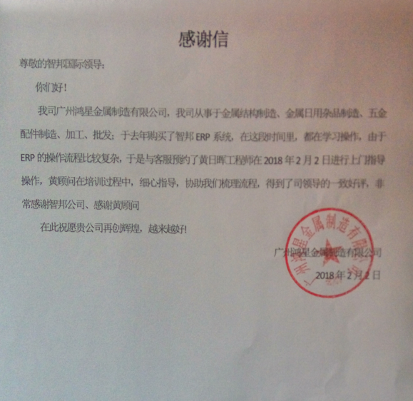 广州鸿星金属制造有限公司智邦国际ERP系统实施现场