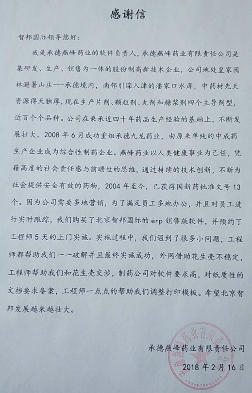 随着承德燕峰药业有限责任公司几十年在行业的深耕,业务迅速增长,团队发展壮大,管理层意识到传统的办公方式已经不能胜任企业管理,因此决定上一款信息化管理系统,来实现销售、采购、生产、财务等统筹化管控。经过功能、软件商资质等层层筛选,最终决定与智邦国际合作,协助实现现代信息化管理。在了解客户情况后,智邦国际实施工程师立即根据情况制定了实施方案,为其部署了智邦国际ERP系统。