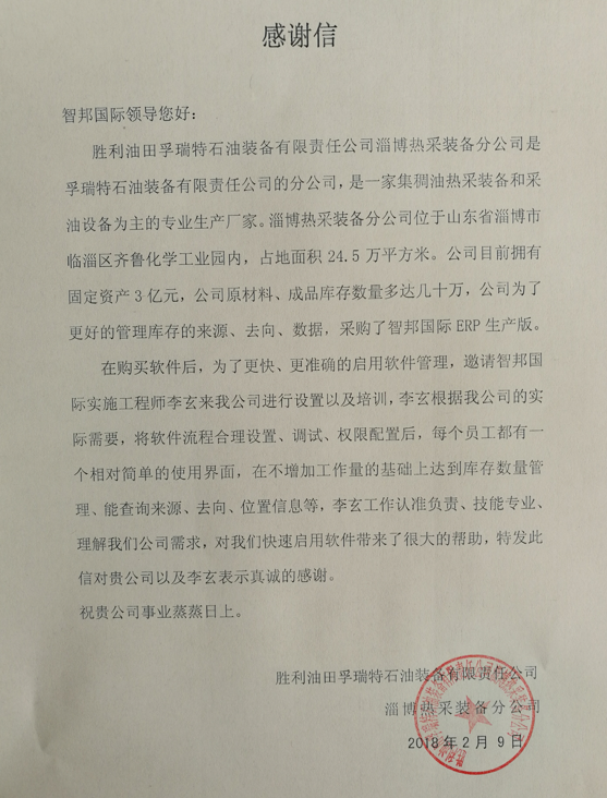 随着胜利油田孚瑞特石油装备有限责任公司淄博热采装备分公司多年的发展壮大,企业得到迅速发展,在生产、采购、库存、财务等管理上,需要统筹信息化快捷管控,经过功能、软件商资质等层层筛选,最终决定与智邦国际合作,协助企业实现现代信息化管理。在了解客户情况后,智邦国际实施工程师立即根据情况制定了实施方案,为其部署了智邦国际ERP系统