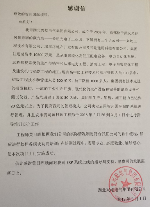湖北兴屹电气集团有限公司智邦国际ERP系统实施现场
