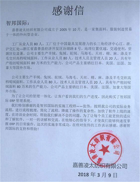 随着嘉善凌太纺织有限公司多年的发展,越来越多的订单需要管理,同时生产、采购、办公等急需变革,管理层意识到要想更好的管理企业,必须依靠信息化管理软件的应用;最终,通过功能、服务、软件商资质等多方面综合对比,与智邦国际达成合作;在了解客户情况后,智邦国际实施工程师立即根据详情制定了实施方案,为其部署了智邦国际ERP系统。