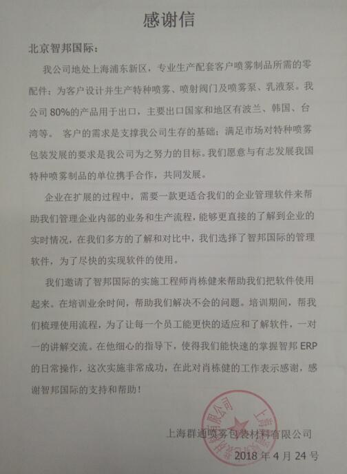 随着上海群通喷雾包装材料有限公司的发展,生产、销售、采购、仓储等管理急迫需要变革,管理层决定上一款信息化管理软件,实现信息化管控。经过功能、软件商资质等层层筛选,最终决定与智邦国际合作,协助实现科学信息化管理;了解客户情况后,智邦国际实施工程师立即根据情况制定了实施方案,为其部署了智邦国际ERP系统