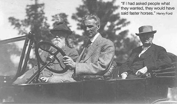 福特说,我在设计汽车之前,到处去问人们“您需要一个什么样的更好的交通工具?”,几乎所有人的答案都是——“我要一匹更快的马”。很多人听到这个答案,于是立马跑到马场去选马配种,以满足客户的需求。但是福特先生却没有,而是接着往下问。