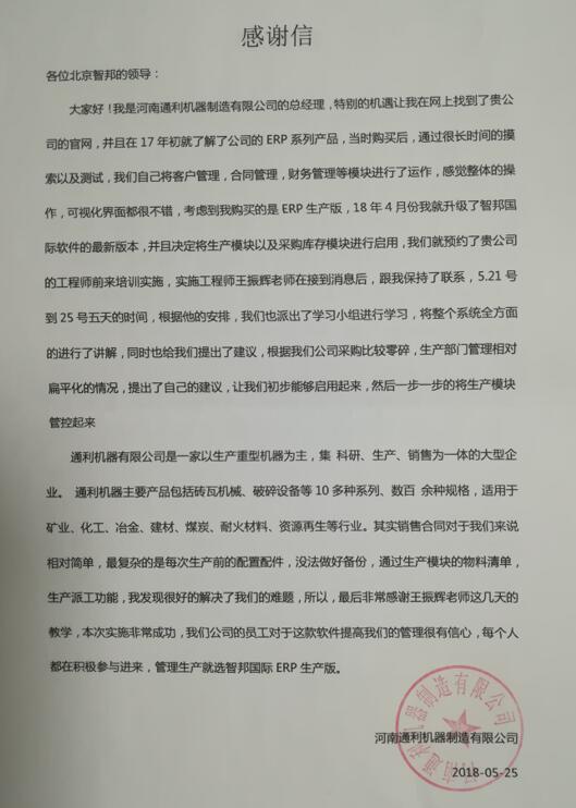 随着河南通利机器制造有限公司多年的发展,业务急速扩展,公司管理层决定通过信息化管理系统,实现生产、业务、仓储等统筹高效化管理;最终,通过功能和服务等多方面的综合对比,与智邦国际达成合作;在了解客户情况后,智邦国际实施工程师立即根据其情况制定了实施方案,为其部署了智邦国际ERP系统。