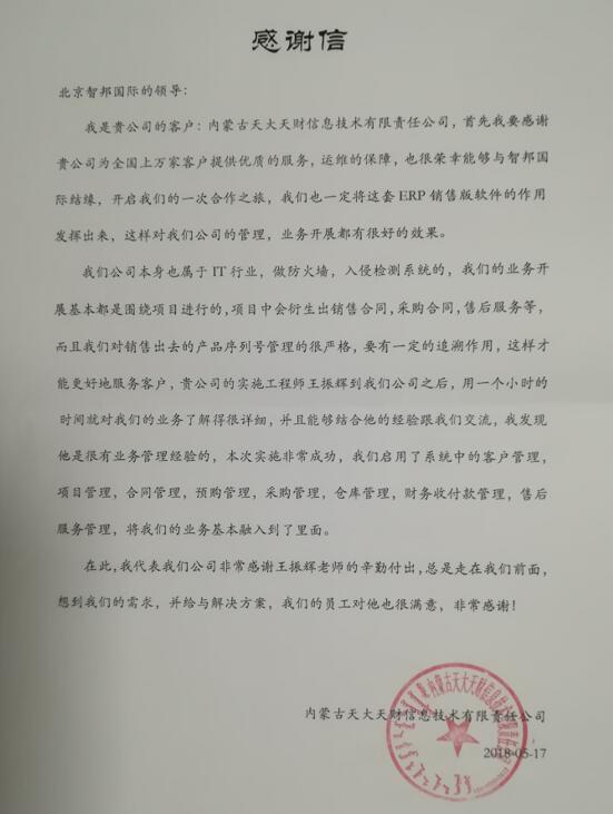 内蒙古天大天财信息技术有限责任公司感谢信