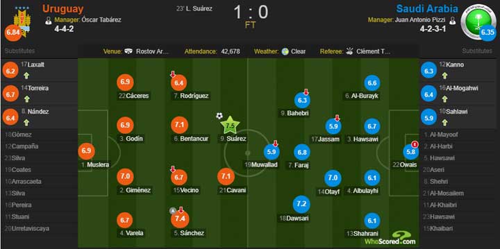 乌拉圭队(图左)采用442阵型1:0战胜沙特队(图右)