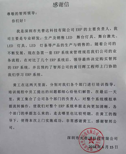 获深圳市光普达科技有限公司书面致谢