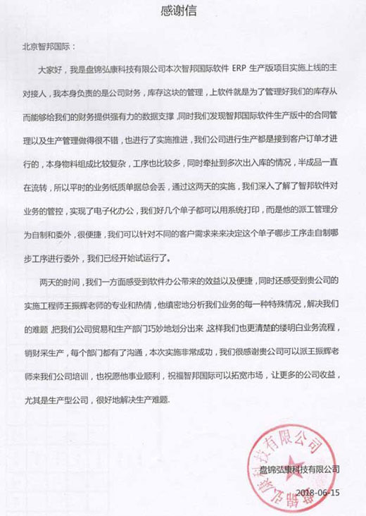 获盘锦弘康科技有限公司书面致谢