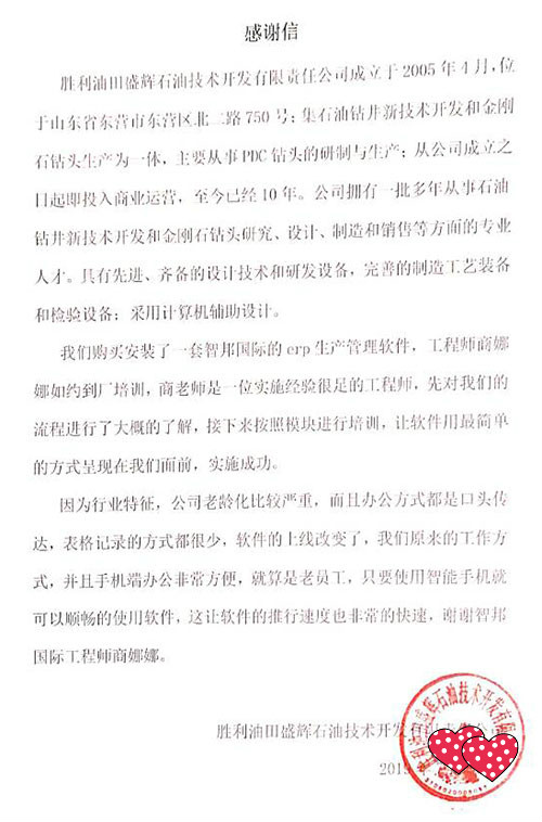 胜利油田盛辉石油技术开发有限责任公司智邦国际ERP系统感谢信