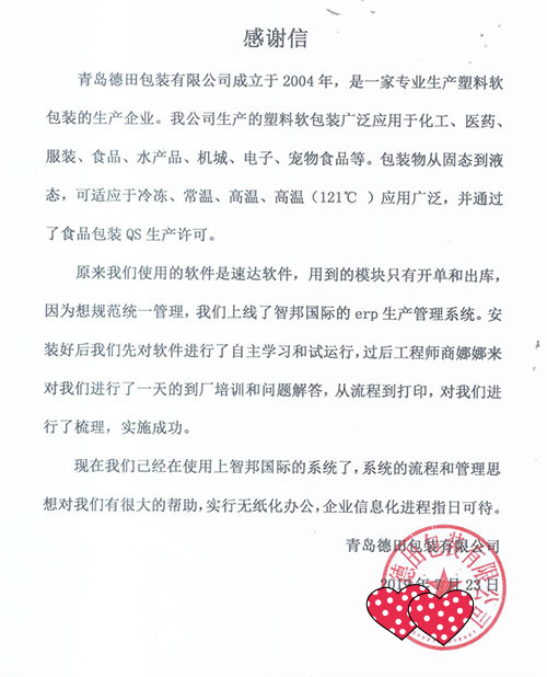青岛德田包装有限公司智邦国际ERP系统感谢信
