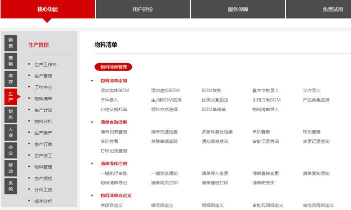 二、 在企业最需要的生产管理方面,ERP系统中包含了预生产计划、生产计划、物料需求分析、生产预测、生产进度监控、物料使用等诸多功能,通过合同系统可产生预生产计划,之后则生成生产计划、生产订单,通过物料需求分析,可直接添加物料清单或EXCEL一键导入物料清单,最后形成BOM表,BOM表会对生产产品所需的物料数量及所需时间进行预测,适时进度汇报,智能掌握每一阶段生产进度情况。