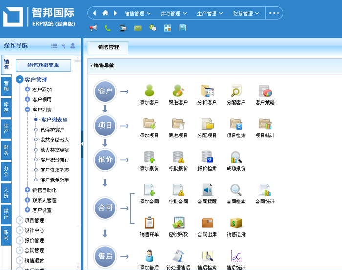 智邦国际ERP系统销售版实行销售一体化管理模式。着力于在一个系统里帮助企业全方位管理销售过程每个环节,系统智能化整合销售、营销、库存、财务、人资及办公等功能模块,并通过部门协同绩效考核不断激发销售潜能,助力企业高效运营。