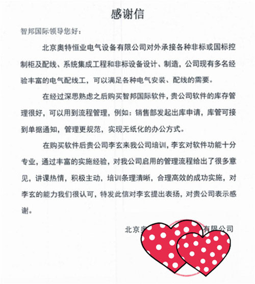 北京奥特恒业电气设备有限公司智邦国际ERP系统感谢信