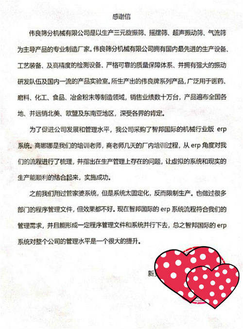 新乡市伟良筛分机械有限公司智邦国际ERP系统感谢信