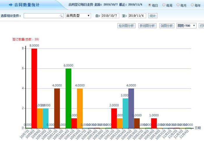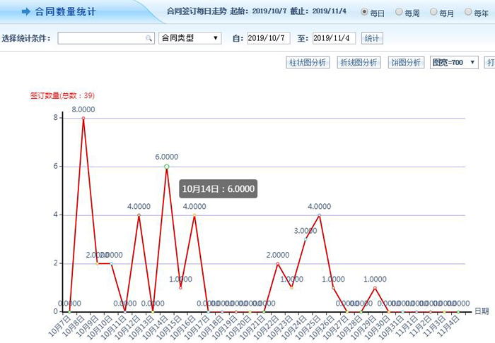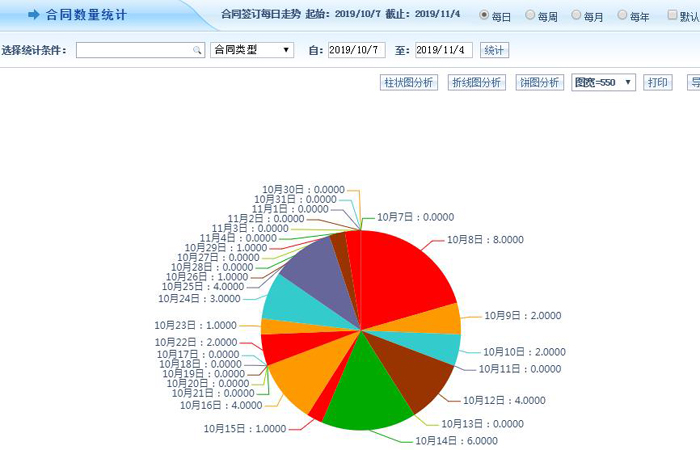 有了智邦国际ERP系统丰富的图形化报表,无论制表人,还是看表人,都不用再像看天书一样那么难了。比如合同数量,怎么分析才能一眼就明白?总共有多少合同,每个时段占比多大?一张图一秒就摸清。