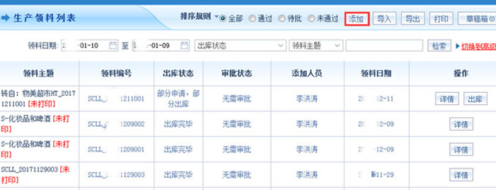 智邦国际ERP系统一键添加生产领料单