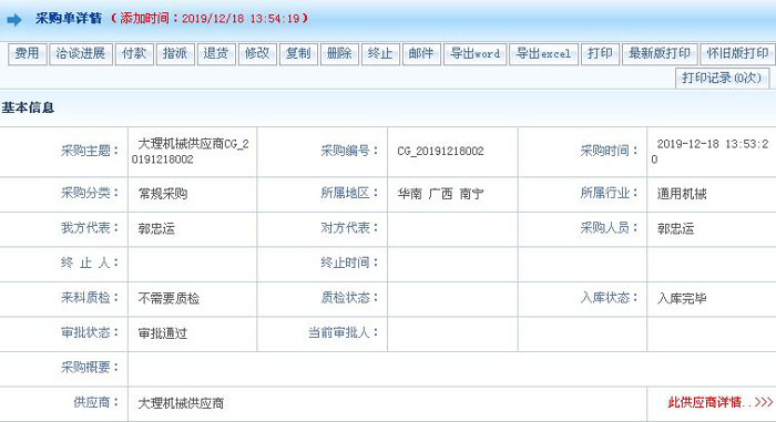 一、系统支持供应商分类、资质、信用、跟进、绩效、采购统一管控,助力业务人员完整记录采购基本信息与关联业务,随时进行采购添加、查询、检索、跟进、点评、导入、打印等。实时掌控从供应商评估、询价比价、采购审批、采购检验等全过程,助力企业节约成本,简化采购流程,提高利润。如遇生产计划变更,采购计划也会自动变更,数据一次录入实现全面应用,帮助业务人员从重复且繁琐的单据更改、录入中解放出来,有更多的时间去做更有价值的事情,例如选择对于企业来说更合适的供货商等,确保采购工作高质量的进行。