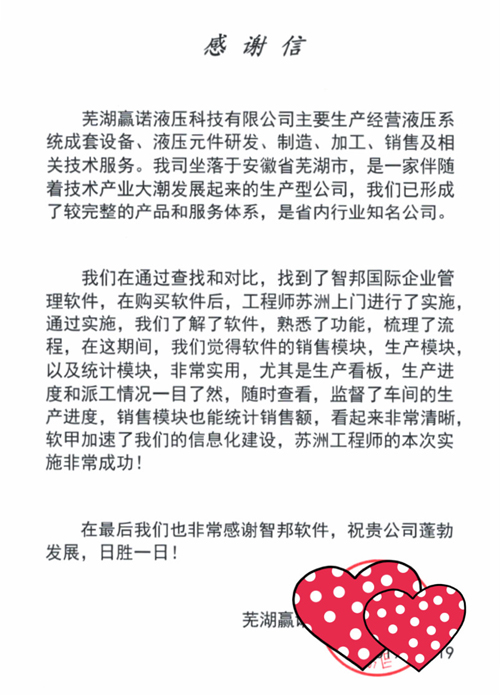 芜湖赢诺液压科技有限公司向智邦国际送感谢信