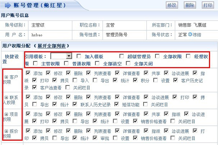 一、系统提供了强大的权限体系,权限细化到最小单元,轻松实现立体交叉式管理。可以根据不同人员的工作需求开放相应的功能权限,既保证了信息的安全性,也让每个员工使用的系统更符合职业特性,简洁明了。关于员工在系统上查看、修改、删除、共享、复制、导入、导出、设置等操作范围均受后台权限严密控制,每一位员工的操作均有所记录,确保数据的精准与安全,权责到人。同时,每个部门或分支机构可以独立管理和分配账号,同时接受总公司的统一监管,当有人员变动时,系统会自动根据设置自动匹配新的权限,真正实现智能化管理。