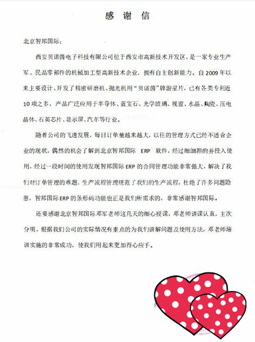西安贝诺茵电子科技有限公司向智邦国际送感谢信
