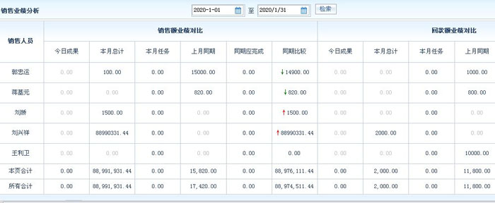 一、在系统中管理层人员可以在销售分析中心的“销售业绩分析”栏目中,以图形化方式便捷查看销售人员的销售额情况和回款额情况,智能化销售业绩分析,实时呈现销售额TOP10,回款额TOP10等,智能监控销售业绩,针对不同人员进行不同的管理方式,实现可持续性发展。此外,在绩效管理中,绩效考核申请、项目设置、结果查询、考核评分、申诉等均可线上实时处理,并且可以在编制工资表时,一键进行考核薪资发放,从多个维度出发,打造企业绩效考核,完善人才管理,提高员工工作积极性,以及企业效率与效益。