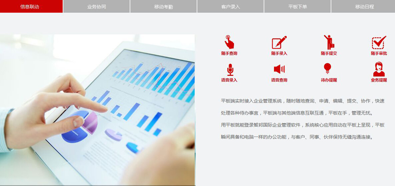 一、智邦国际致力于助力企业建立可移动的信息化系统,为企业提供了与PC端信息共享的手机端、平板端管理方式,还有与系统版本相配套的APP,让企业管理层可以随时随地移动办公,有针对性的进行碎片化节点应用。此外,支持管理层及业务人员实时查看合同订单、生产进度、库存信息等,可在移动端直接填写、语音录入、自动提交订单,提高办公效率与质量。管理人员可以实时查看、一键审批订单,业务人员可以及时发货、快速结算,省去大量沟通时间,工作更加便捷高效。