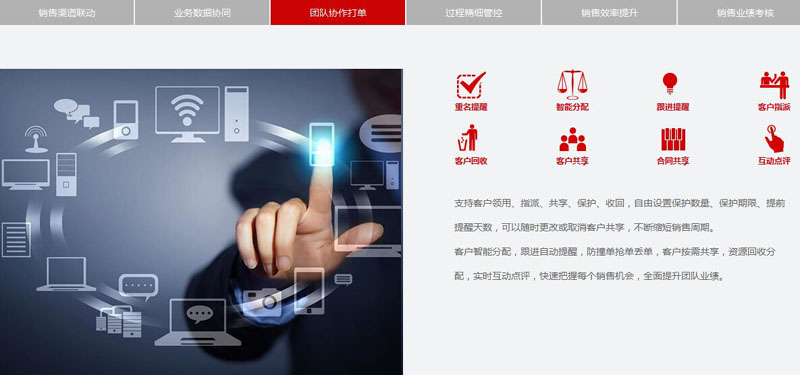 一、系统采用一体化管理理念,致力于助力企业在一套软件解决企业日常管理需求,在一个平台集成化管理数据,一次录入实现各环节的全面互联。通过同一平台,线上实时记录客户信息,洽谈进展,领用、共享客户等均可一键操作,让接单变得更加简单高效。在线上即时建项目、提报价、立合同以及进行售后管理,各项数据实时共享协同,满足行业和企业不断发展变化中对核心业务的管理需求。将企业同客户互动的全过程数字化、智能化,帮助企业实现可持续的业绩增长。