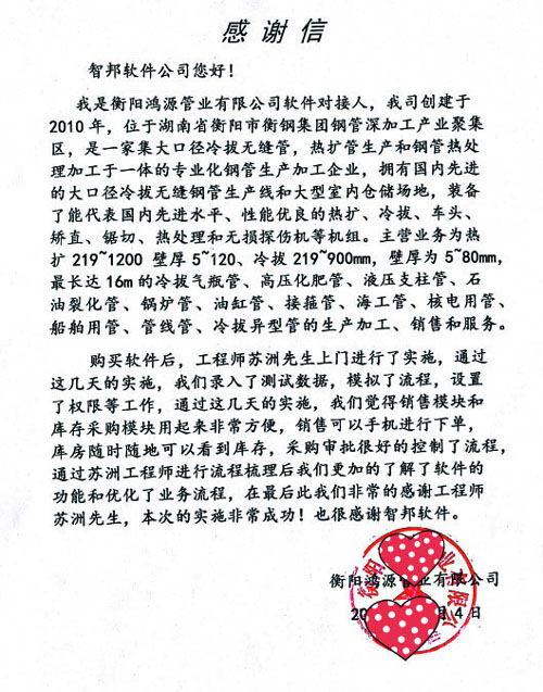 衡阳鸿源管业有限公司向智邦国际送感谢信