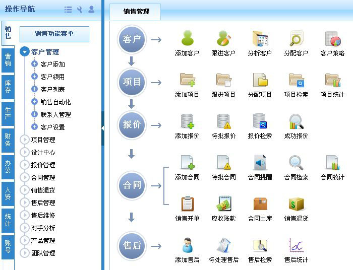 智邦国际工程师在了解到企业基本管理需求后,为其推荐演示了智邦国际ERP系统销售版,企业管理层表示系统功能可以满足企业所需,并最终购买了智邦国际ERP系统。智邦国际ERP系统销售版拥有销售、库存、财务、人资及办公等功能模块,其中客户、项目等销售管理环节互联互通,自动流转,一体化运作助力企业敏捷运营。