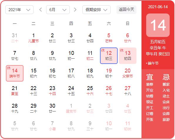 6月12日(星期六)至14日(端午节,星期一)放假,共3天。放假期间若给您带来不便,敬请谅解!