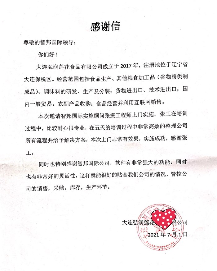 大连弘润莲花食品有限公司向智邦国际送感谢信