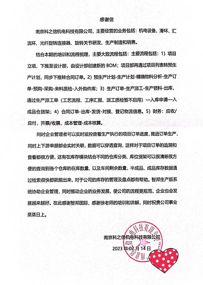 近日,南京科之信机电科技有限公司签约智邦国际,希望通过智邦国际ERP系统的使用,一个平台兼容企业全部业务数据,数据一次录入全面应用,全程监控各环节运转和协作,全面提升企业管理和协作效率。